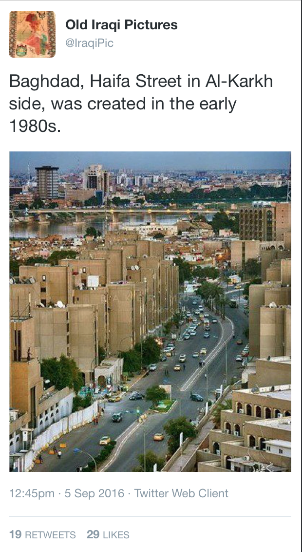 Within about 24 hours of finishing the novel, I learned about the Twitter account Old Iraqi Pictures, which also launched about a year and half ago, featuring photography going back over a century of the country's cities, archaeological sites, architecture, street scenes and people. The site has also posted photos from the U.S. Invasion itself. Scrolling through the account's posts brought Bennet's aggressive and dismal descriptions of the assaulted, occupied, threatening urban ruin to an even more poignant horror.
